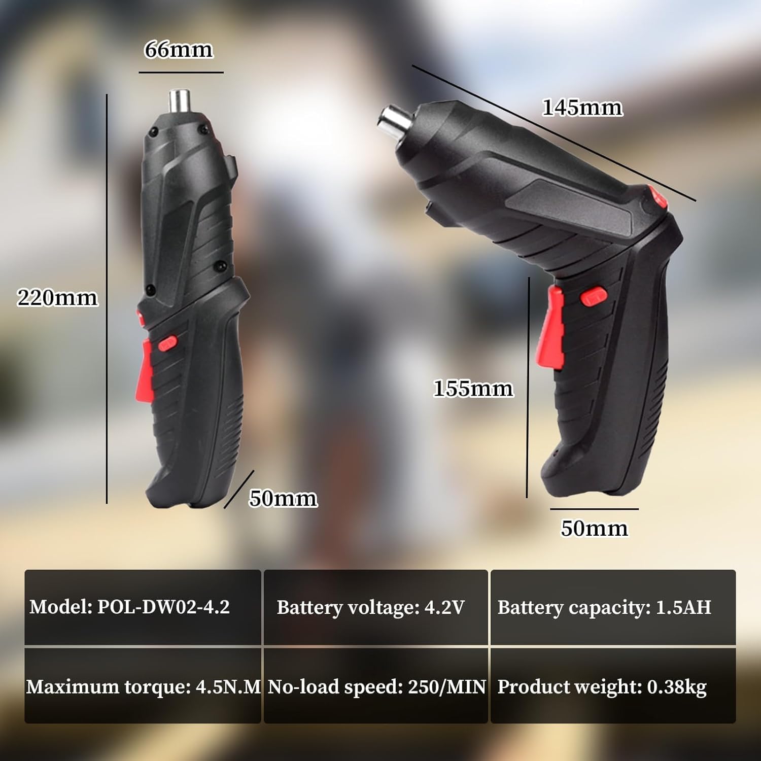 - COMPLETE ACCESSORIES SET: Cordless screwdriver set including 42 CRV heads, 1 extension rod, 1 charging cable, flexible shaft (flexible shaft is convenient for working in small spaces or when the direction of the screwdriver is unstable), toolbox, and instruction manual.